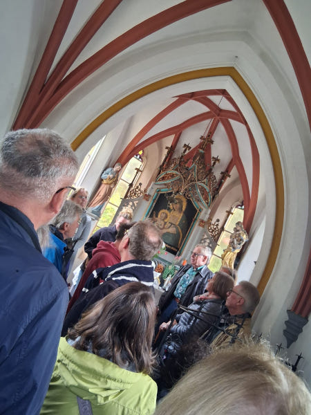 Die Wasserburger Maurerzunft besteht schon seit 215 Jahren und ist die Zunft nicht nur der Maurer und Steinmetze, sondern auch der Kaminkehrer und Hafner in und um Wasserburg. Der Innenraum zeigt trotz begrenzter Größe eine Vielzahl von interessant gestalteten Bauelementen. Die von Strebepfeilern gestützte Kapelle besteht aus dem kurzen Schiff und dem dreiseitig geschlossenen Chor im Norden. Über dem Giebel der Fassade im Süden, in der sich das Portal befindet, erhebt sich ein Dachreiter. Der Innenraum ist mit einem Kreuzrippengewölbe überspannt. Die Maurerzunft mit dem Vorsitzenden Harry Petermann freute sich besonders, bei der Führung auch ihre Arbeit vorzustellen. Gerade in diesem Jahr wurde umfangreiche Sanierungsmaßnahmen durchgeführt und die Kapelle präsentierte sich im neuen Glanz.